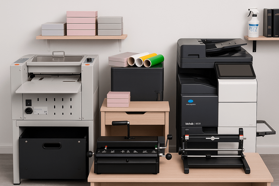 By Mark Pammesberger/BROOLED LTD— three years owning all three machines, running a compact business-card printing setup alongside a Minolta Bizhub C450i with binder, puncher and folding add-on. Meta description: A practical,Business Card Printing: My 3-Year Journey with the Magnum MCC35, Rhin-O-Tuff HD8370 and HD7700