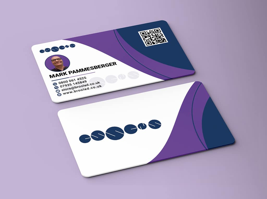 Doublesided Essens Business Card in a Purple Theme. It features your Store QR Code, your Name, Address, Phone Number, Email Address, URL to your store. 250 Business Cards 500 Business Cards