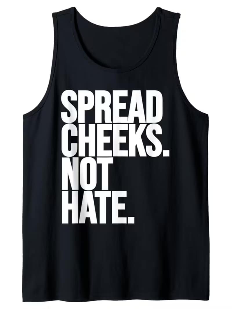 Men’s Sleeveless Dumbbell Print Crew Neck Black Tank Top – “Spread Cheeks Not Hate”